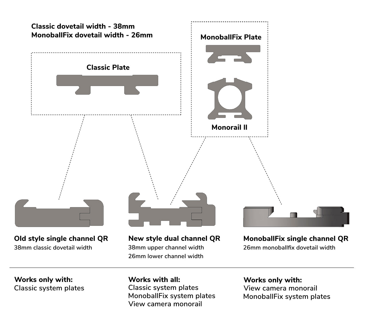 View camera monorail, Pan System Pro, Macro Table, and X-Table are the same base profile as monoball®Fix camera plates. All will mount and adjust freely within the lower channel of a Classic or FlipLock® quick release or any single channel monoball®Fix quick release.