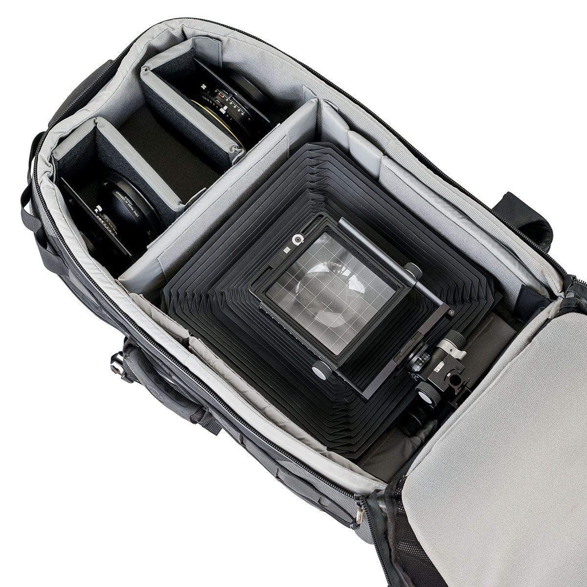 Once collapsed, the camera can fit comfortably inside a standard backpack that has a depth of 15 cm / 6" to accomodate the monorail, with room above to pack a focusing cloth and film holders.