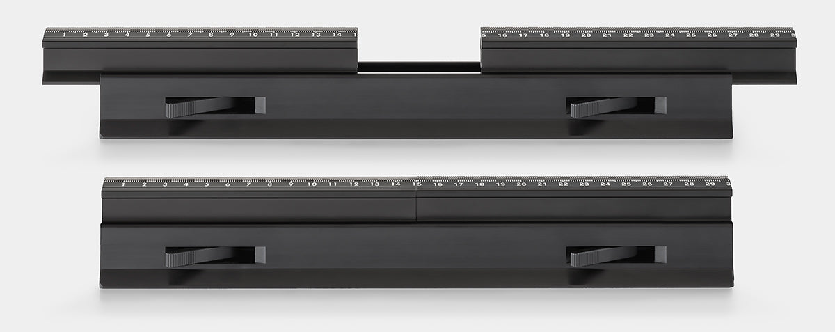 Monorail can quickly telescope outside the connecting bracket to lengthen the bellows extension. Monorail units are available in 15 cm to 40 cm lengths.
